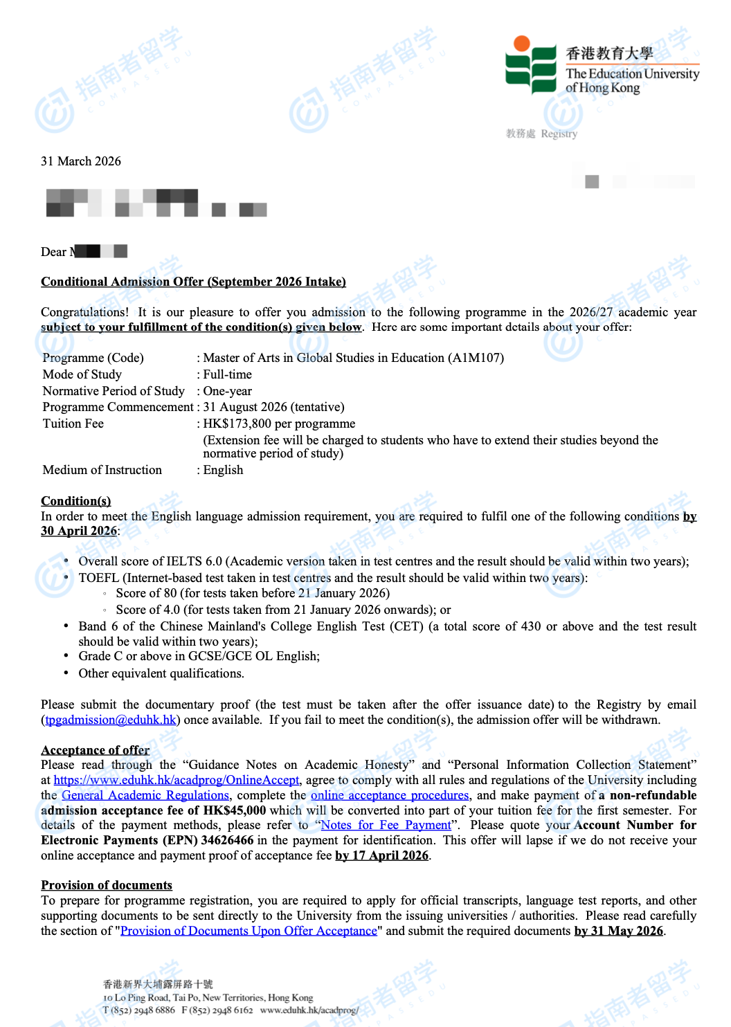 香港教育大学全球教育研究文学硕士研究生offer一枚