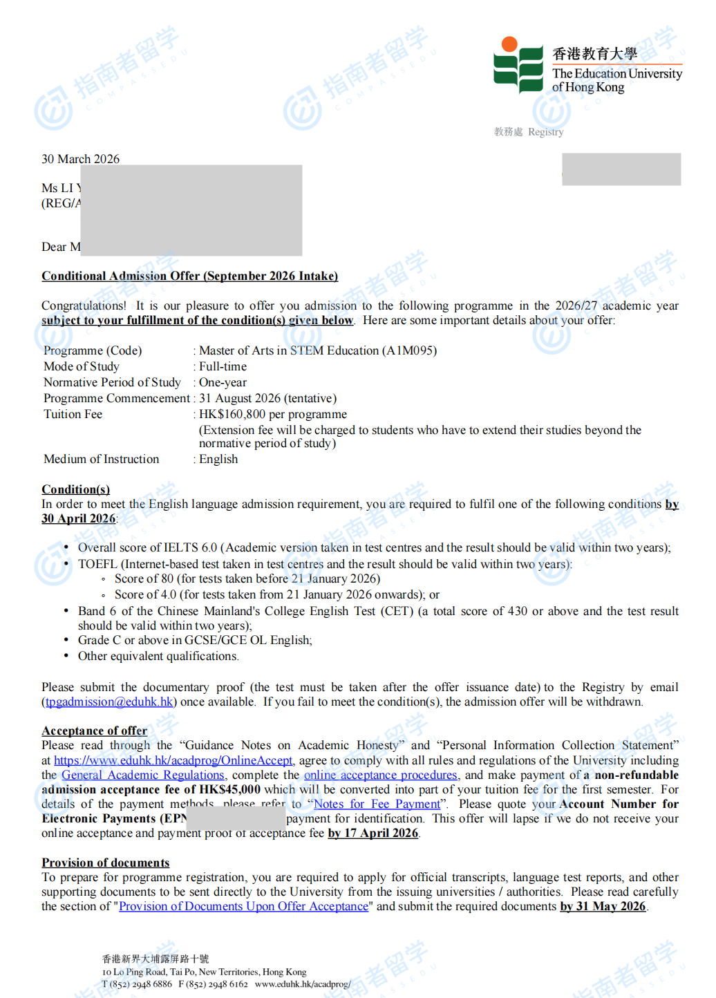 香港教育大学STEM(科学技术工程数学)教育文学硕士研究生offer一枚
