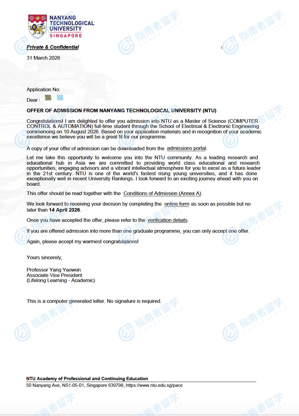 南洋理工大学计算机控制与自动化理学硕士研究生offer一枚