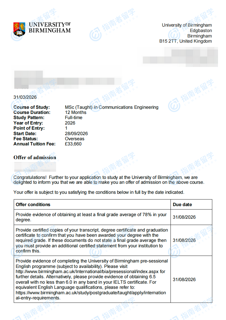 伯明翰大学通信工程理学硕士研究生offer一枚