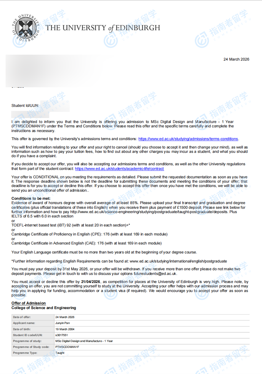 爱丁堡大学数字化设计与制造理学硕士研究生offer一枚