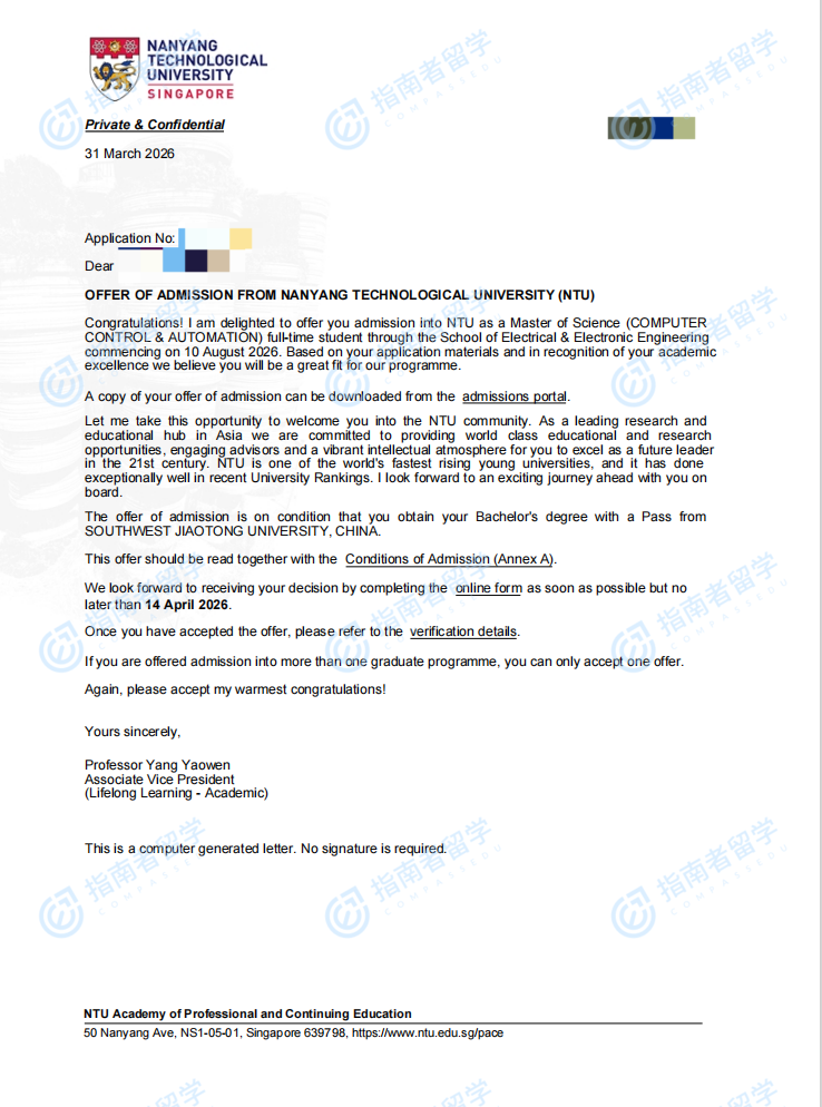 南洋理工大学计算机控制与自动化理学硕士研究生offer一枚