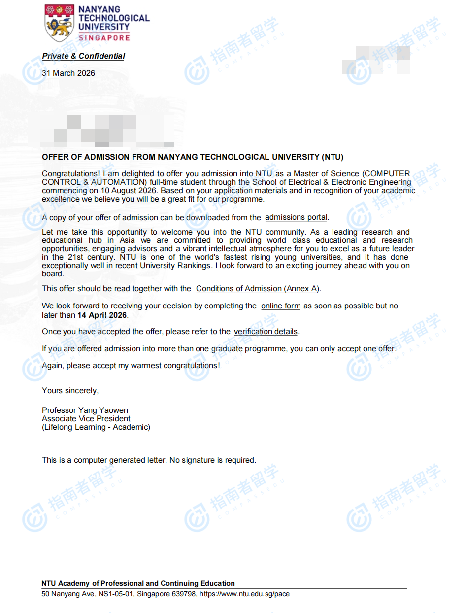 南洋理工大学计算机控制与自动化理学硕士研究生offer一枚
