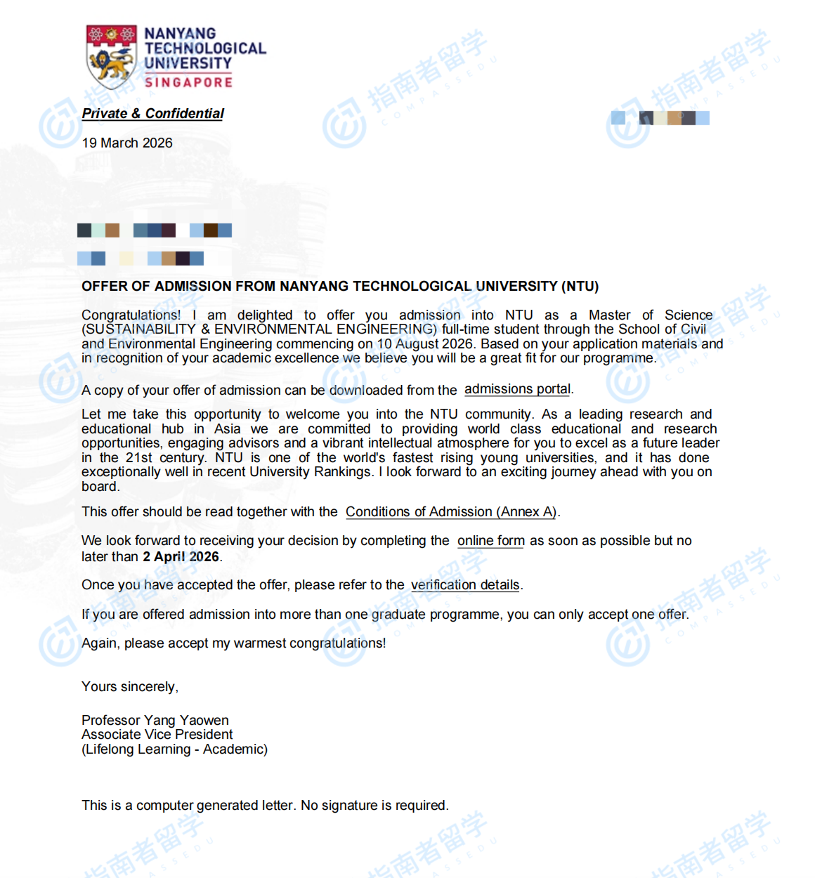 南洋理工大学可持续发展与环境工程理学硕士研究生offer一枚