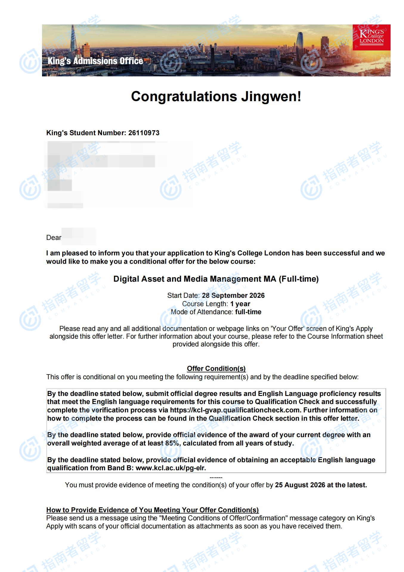 伦敦大学国王学院数字资产与媒体管理文学硕士研究生offer一枚