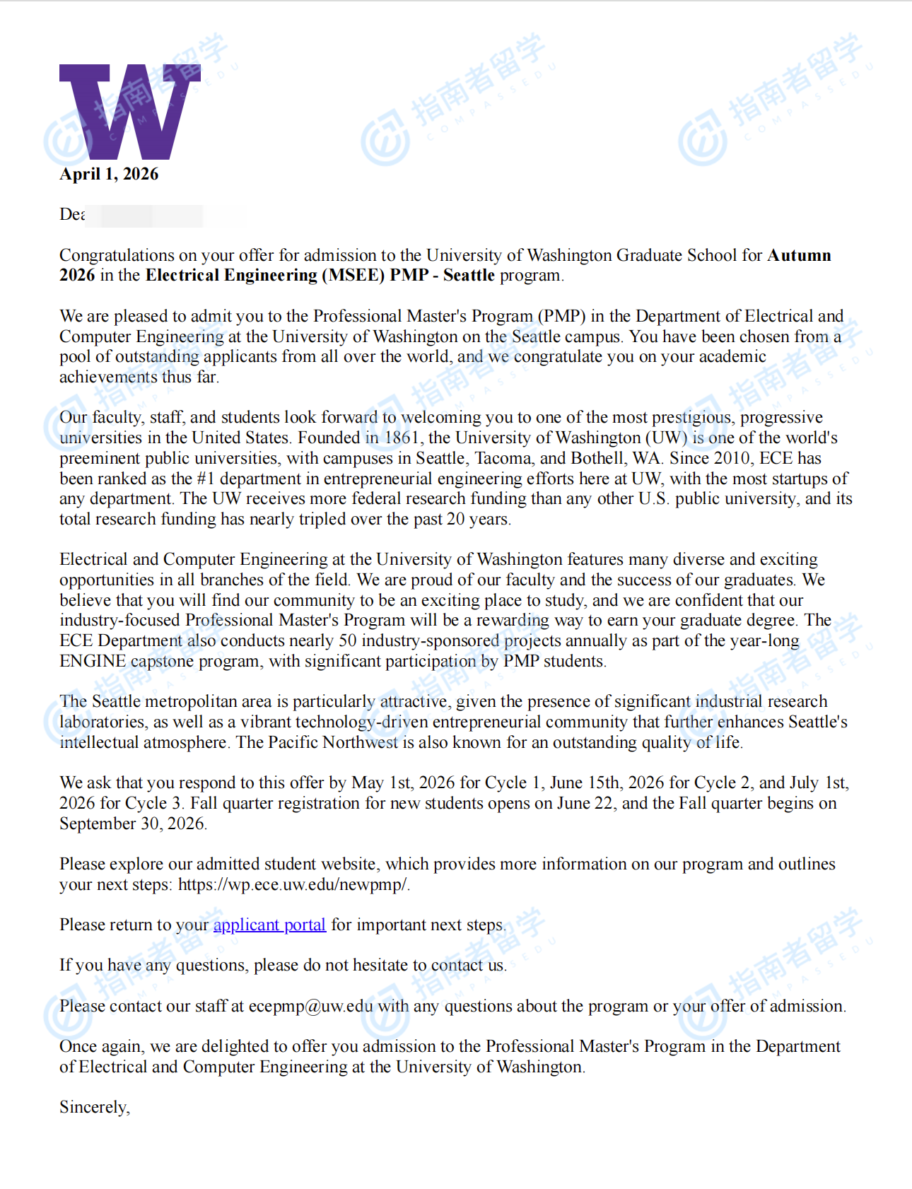 华盛顿大学电气工程理学硕士研究生offer一枚