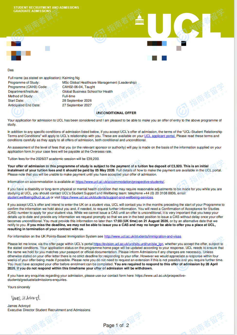 伦敦大学学院全球医疗保健管理(领导力)理学硕士研究生offer一枚