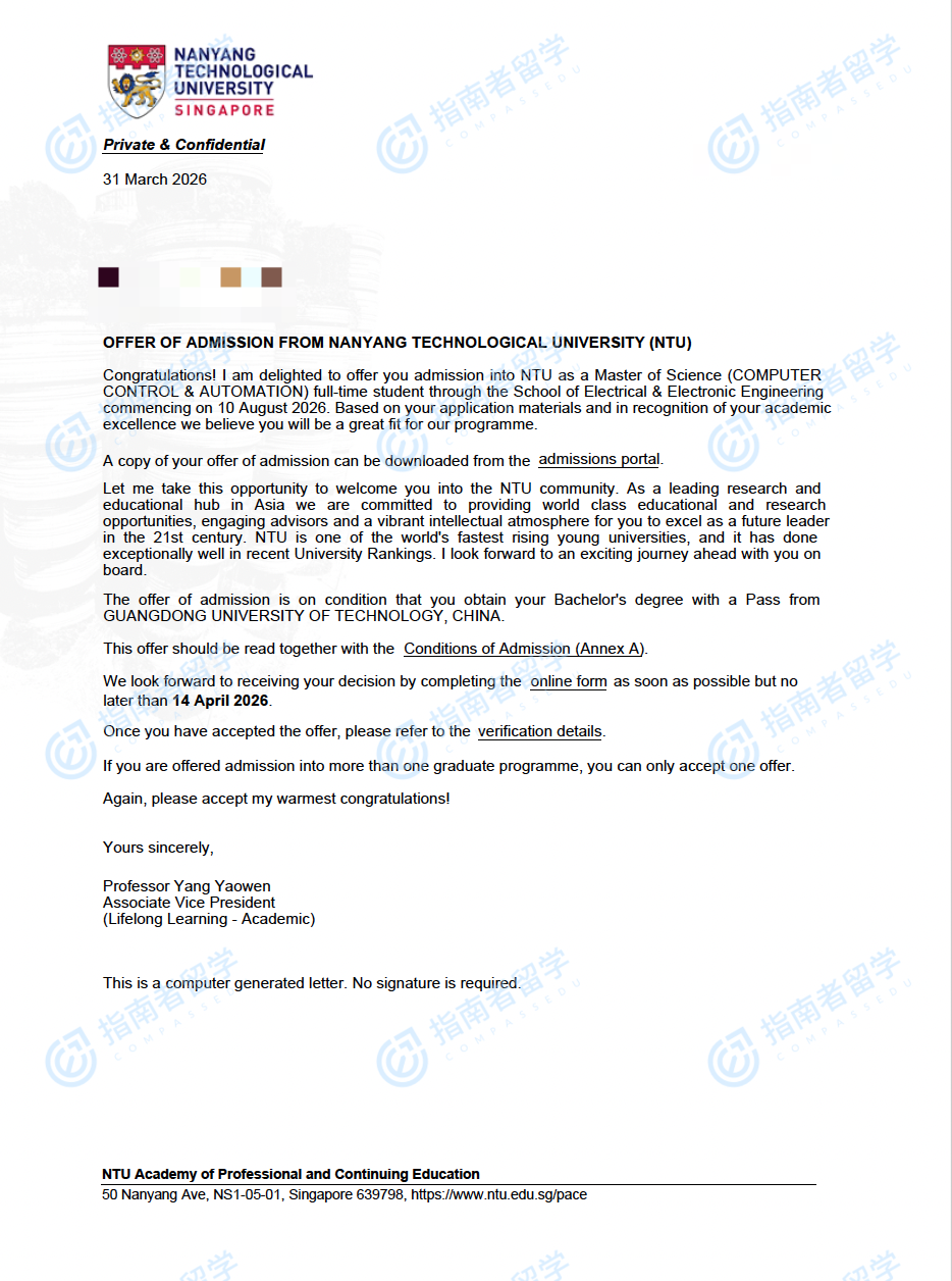 南洋理工大学计算机控制与自动化理学硕士研究生offer一枚