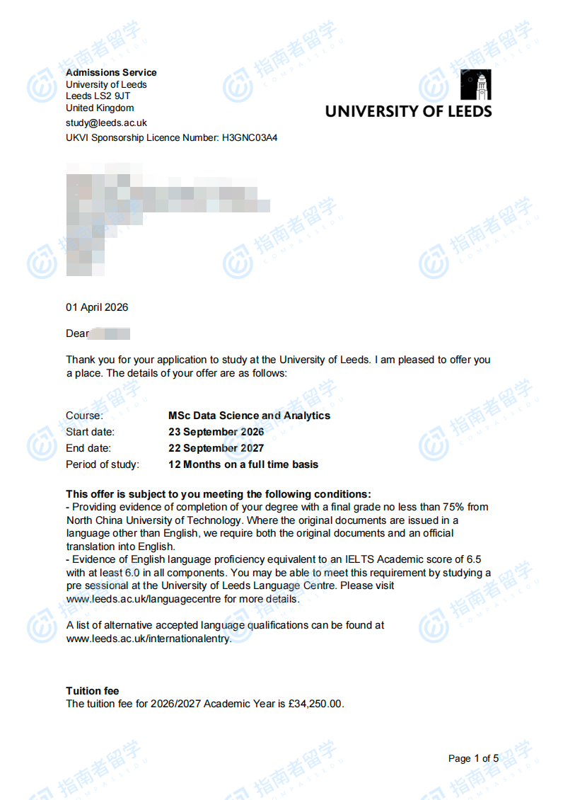 利兹大学数据科学与分析理学硕士研究生offer一枚