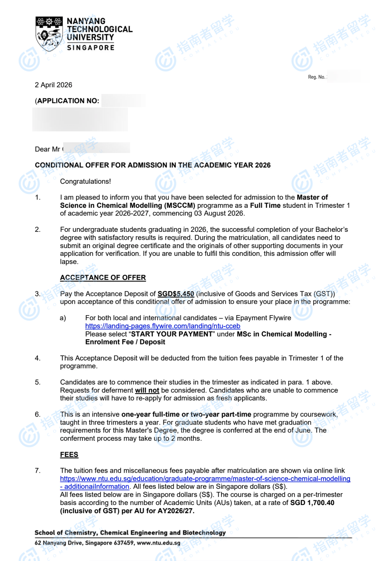 南洋理工大学化学建模理学硕士研究生offer一枚