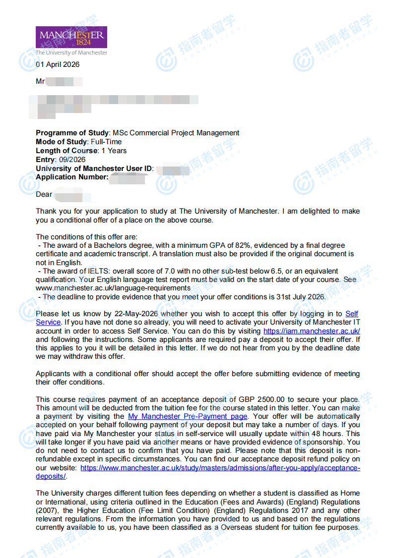 曼彻斯特大学商业项目管理理学硕士研究生offer一枚
