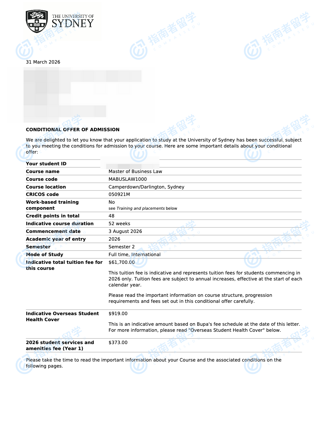- 具有悉尼大学颁发的学士学位或同等学历,平均学分达到65%;或<br> - 具有悉尼大学颁发的学士学位或同等学历,并且申请者需要提供2年相关专业经验的证据。<br> 未在普通法司法管辖区获得法律学位的学生还必须完成LAWS6252法律推理与普通法体系的课程学习