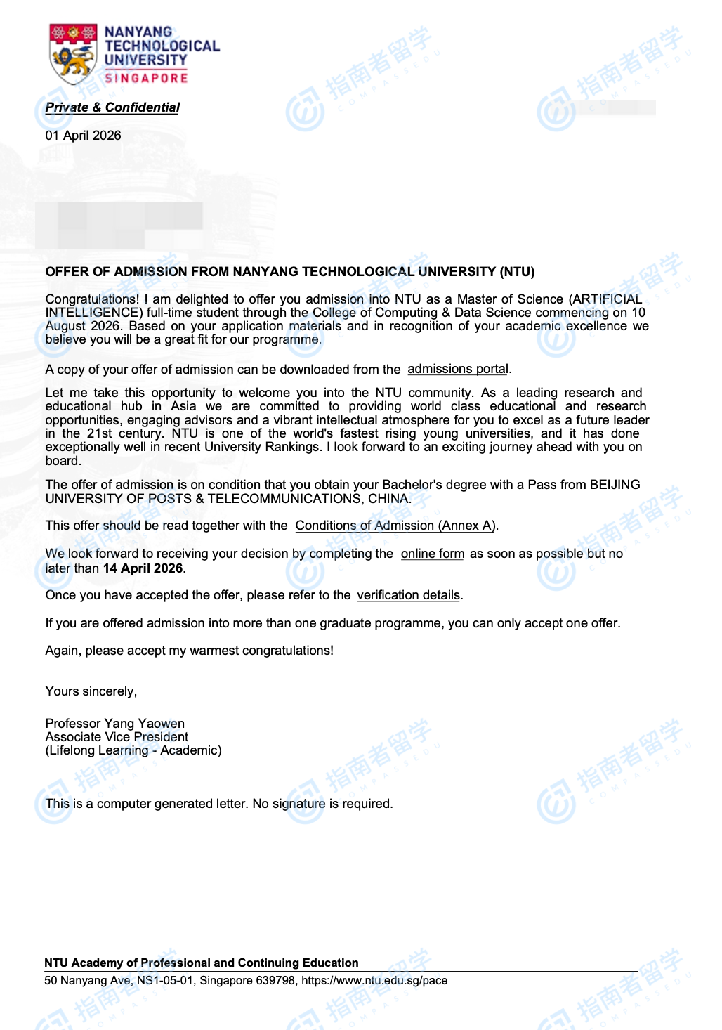 南洋理工大学人工智能理学硕士研究生offer一枚