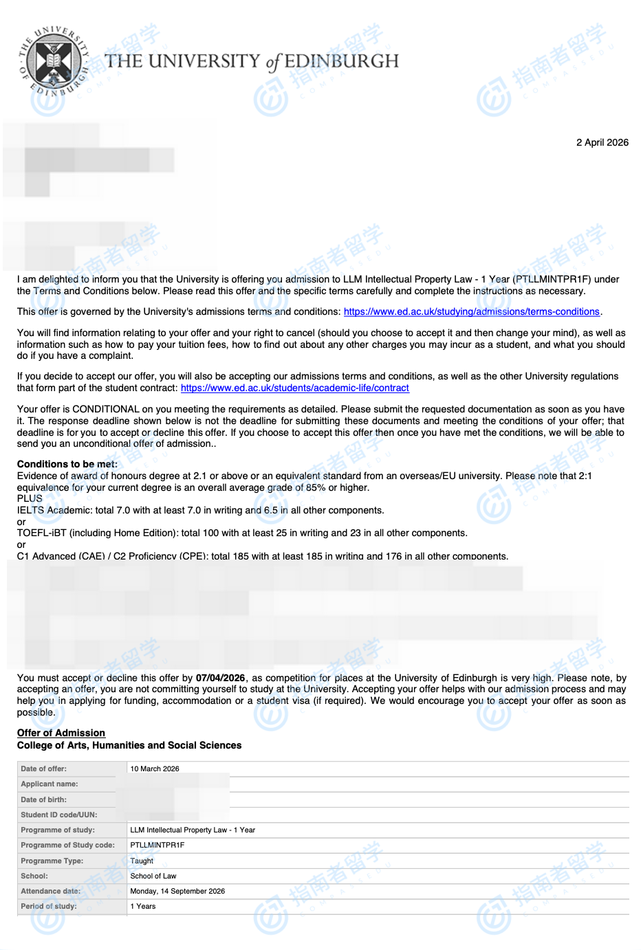 爱丁堡大学知识产权法法学硕士研究生offer一枚