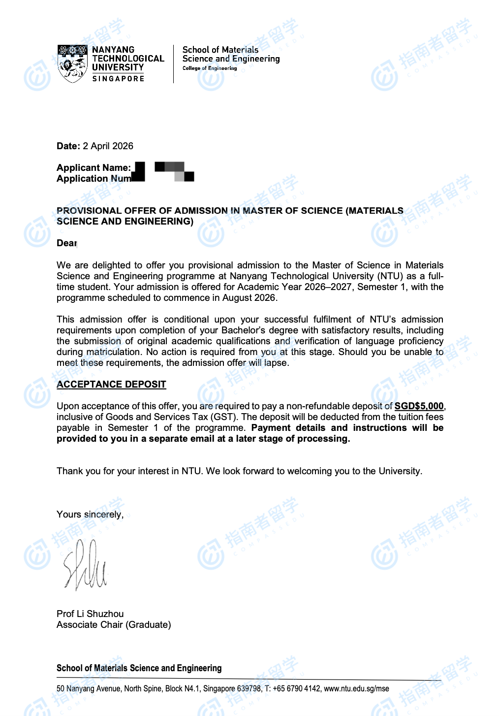南洋理工大学材料科学与工程理学硕士研究生offer一枚