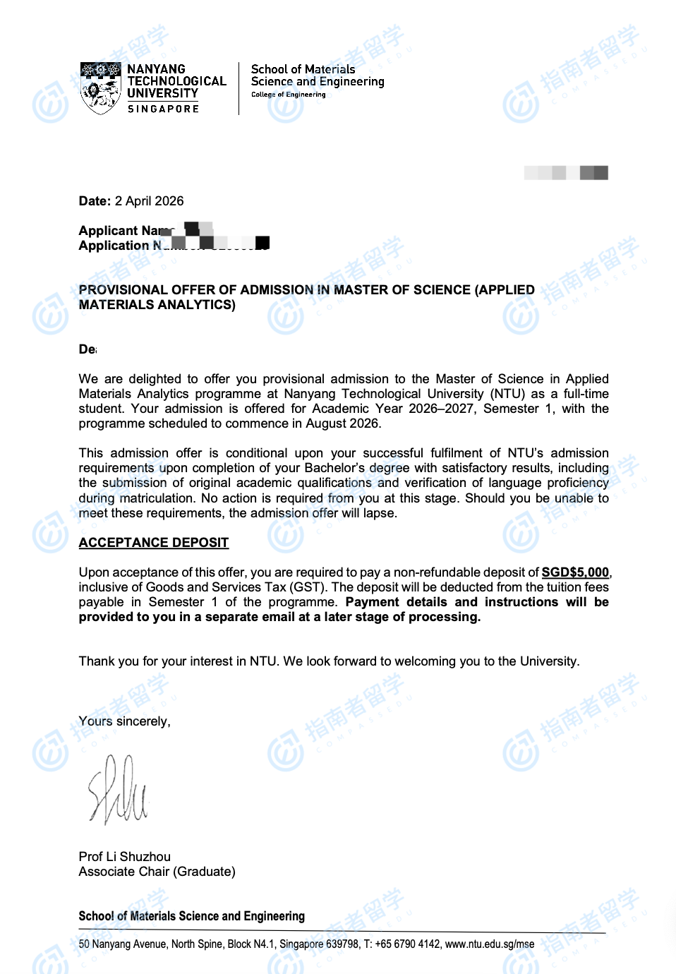 南洋理工大学应用材料分析理学硕士研究生offer一枚