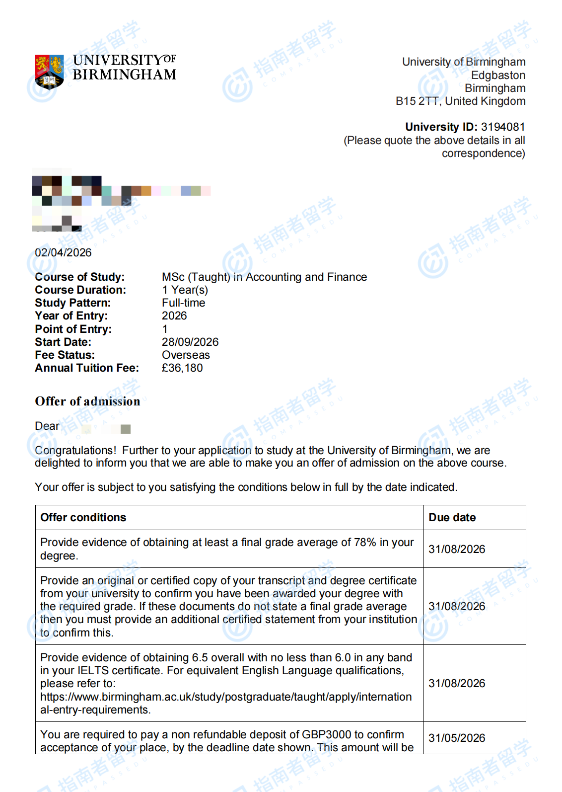 伯明翰大学会计与金融理学硕士研究生offer一枚