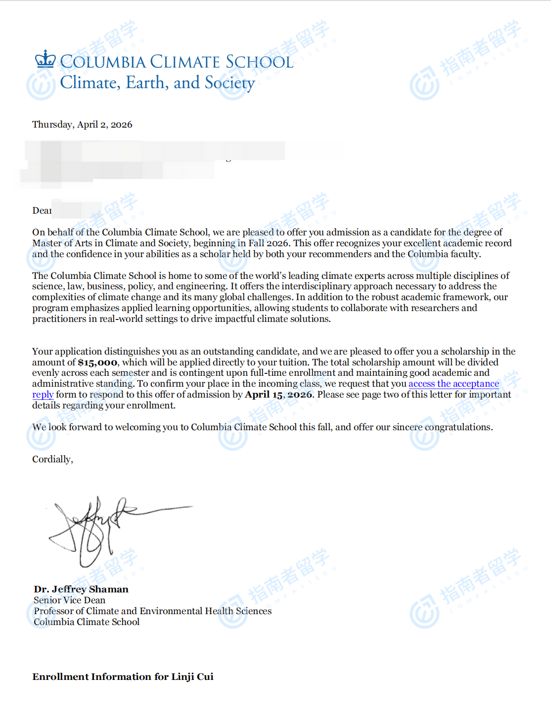 哥伦比亚大学气候与社会学文学硕士研究生offer一枚