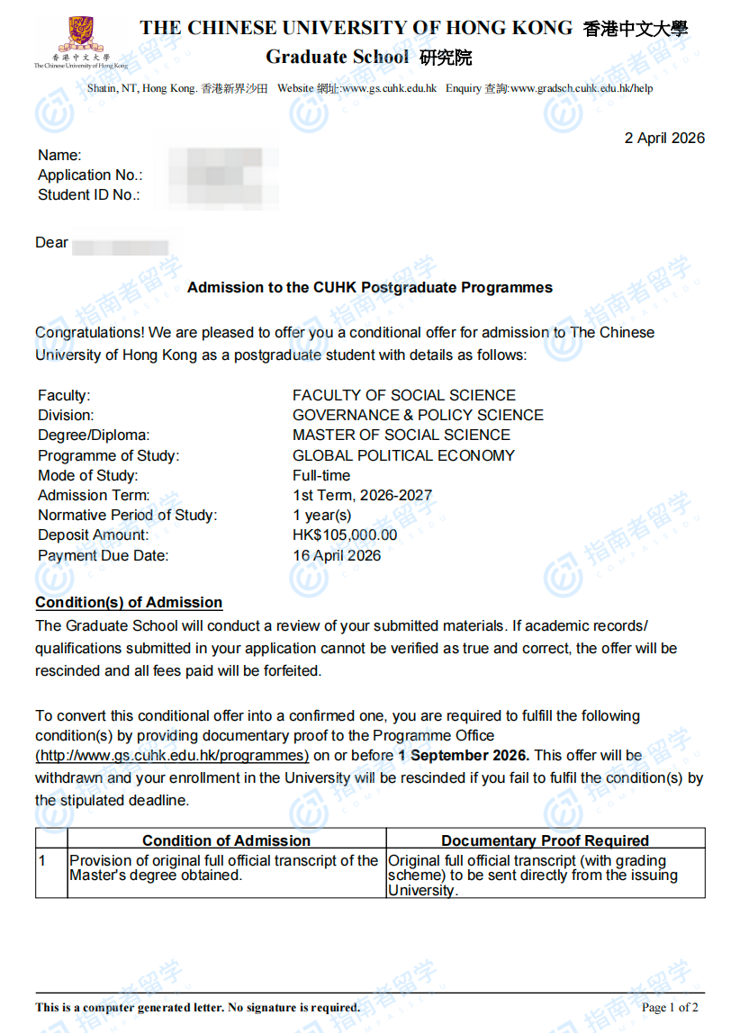 香港中文大学全球政治经济学社会科学硕士研究生offer一枚
