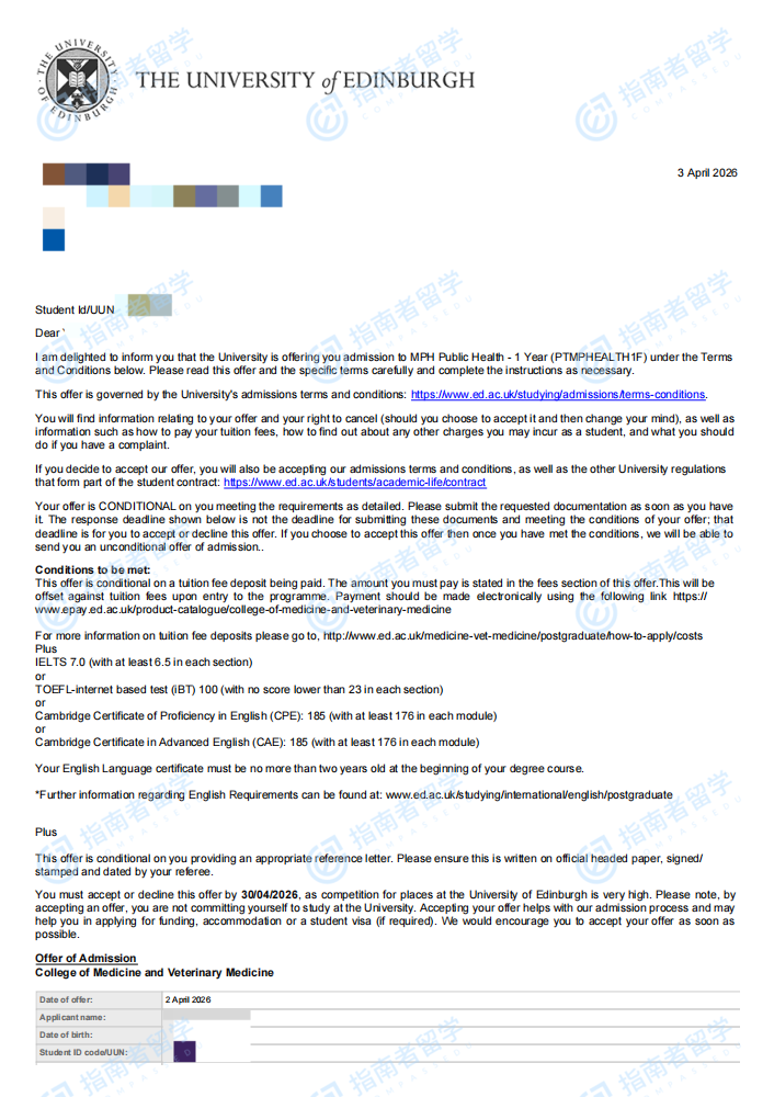 爱丁堡大学公共卫生硕士研究生offer一枚