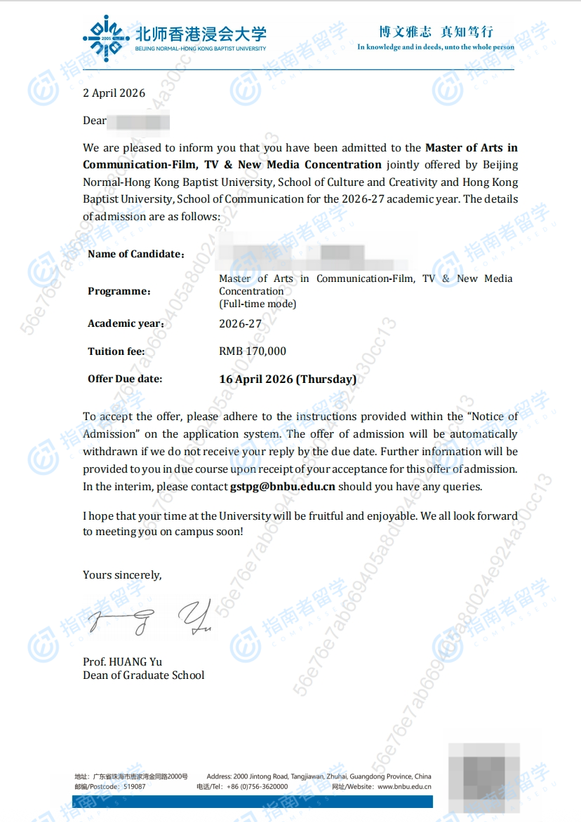 香港浸会大学传播学文学硕士 影视与新媒体制片管理专修(北师港浸大)研究生offer一枚