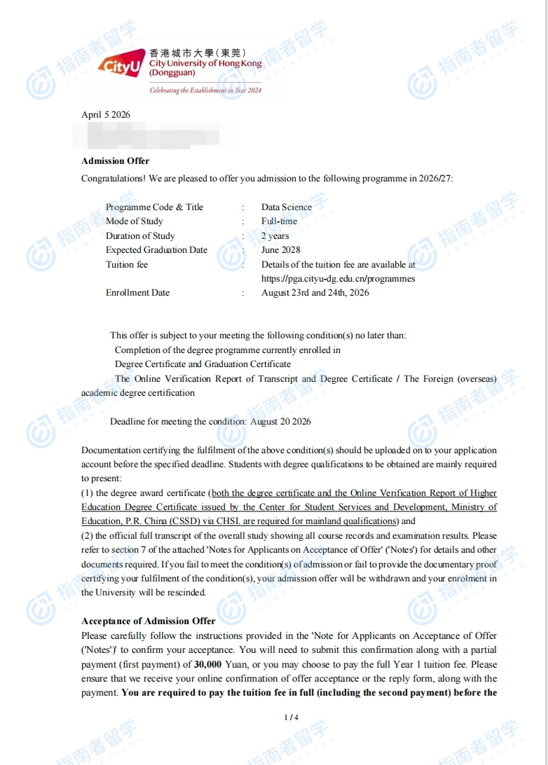 香港城市大学数据科学理学硕士(CityU-DG)研究生offer一枚