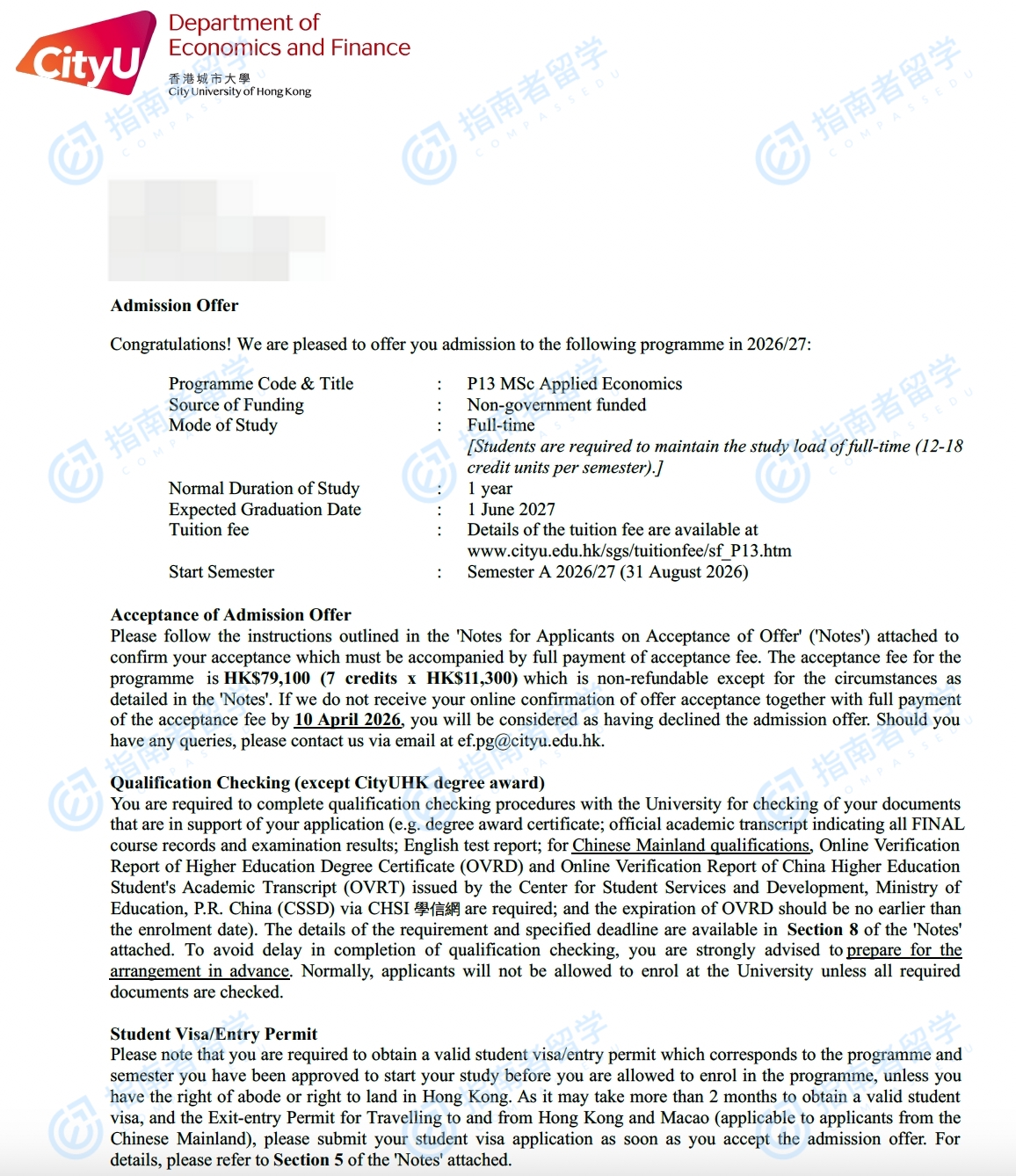 香港城市大学应用经济学理学硕士研究生offer一枚