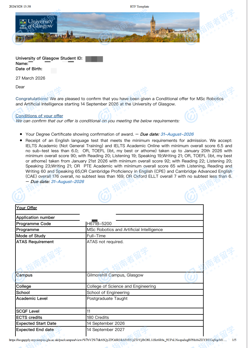 格拉斯哥大学机器人与人工智能理学硕士研究生offer一枚