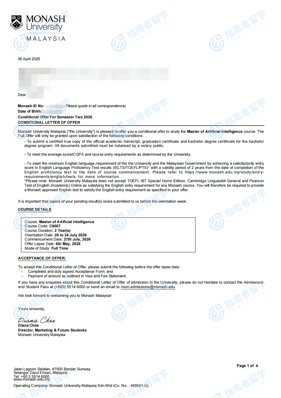 马来西亚莫纳什大学人工智能硕士研究生offer一枚