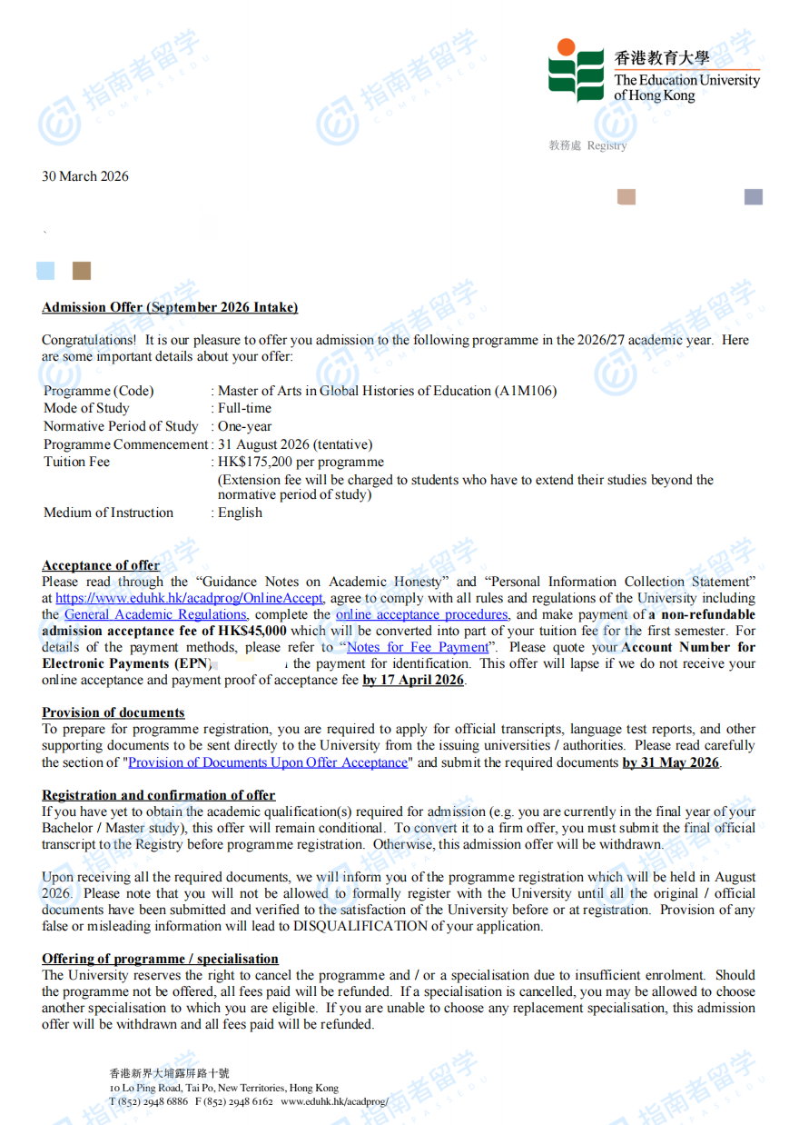 香港教育大学全球教育史文学硕士研究生offer一枚