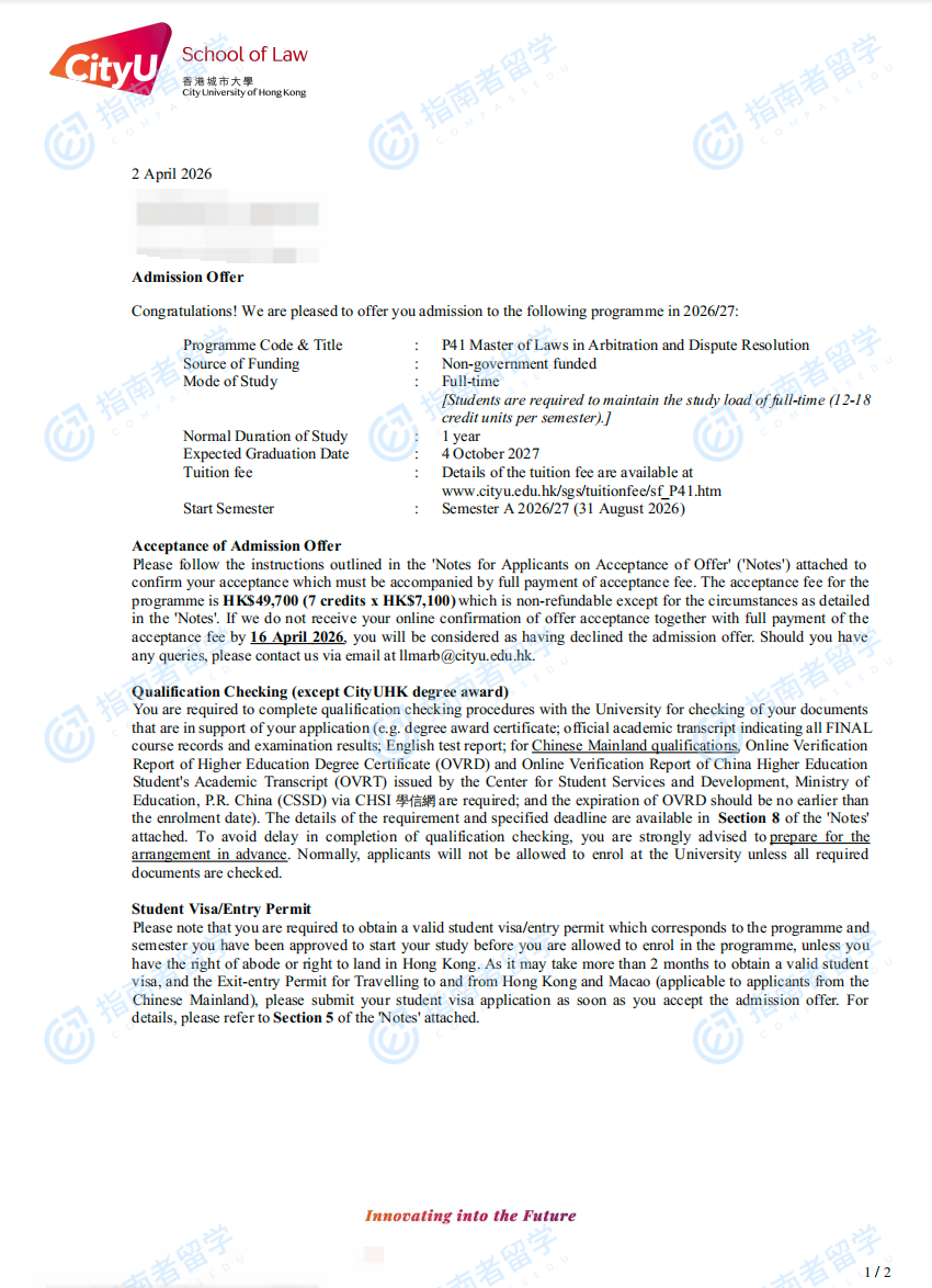 香港城市大学仲裁与争议解决法学硕士研究生offer一枚
