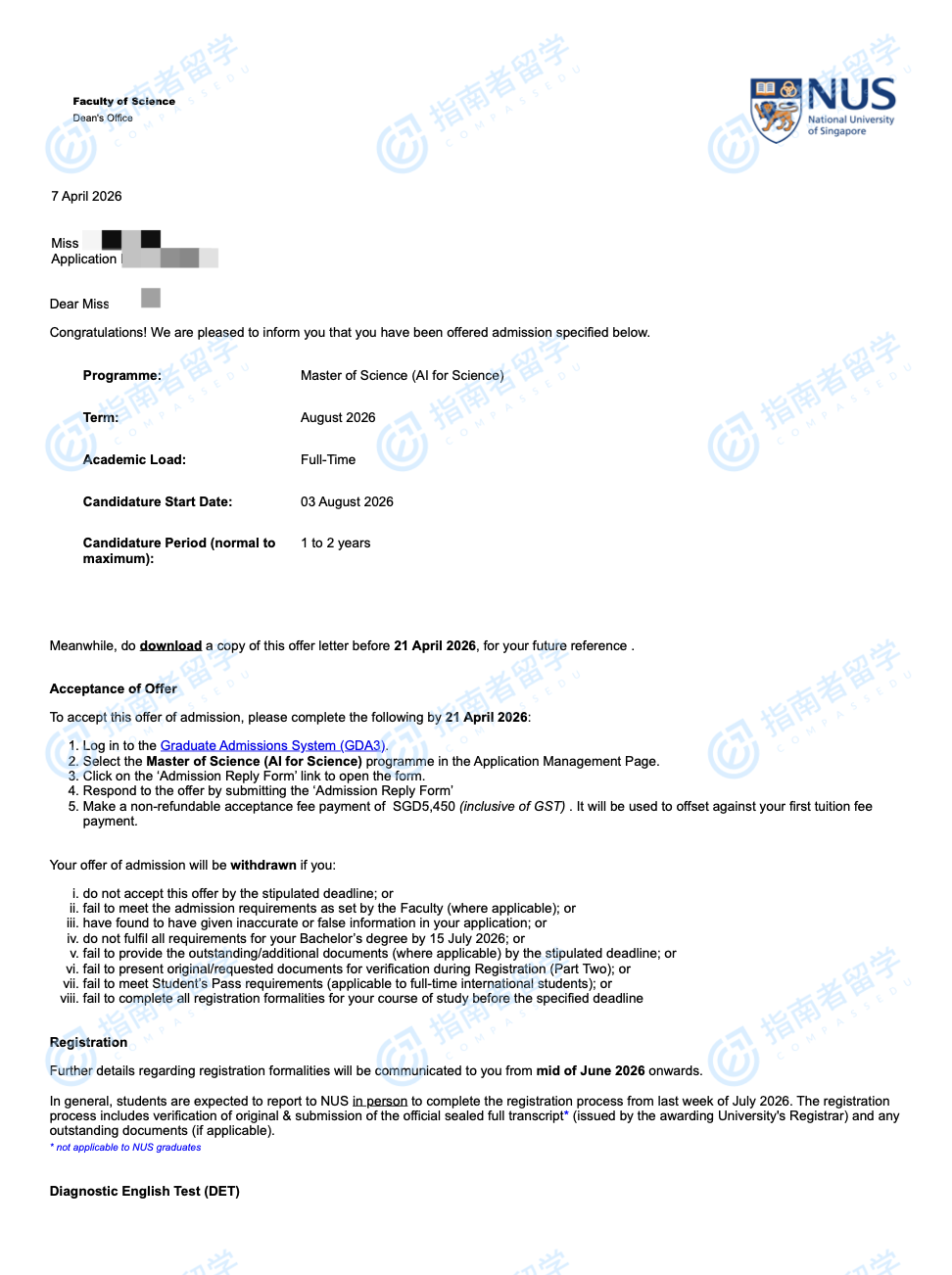 新加坡国立大学科学智能理学硕士研究生offer一枚