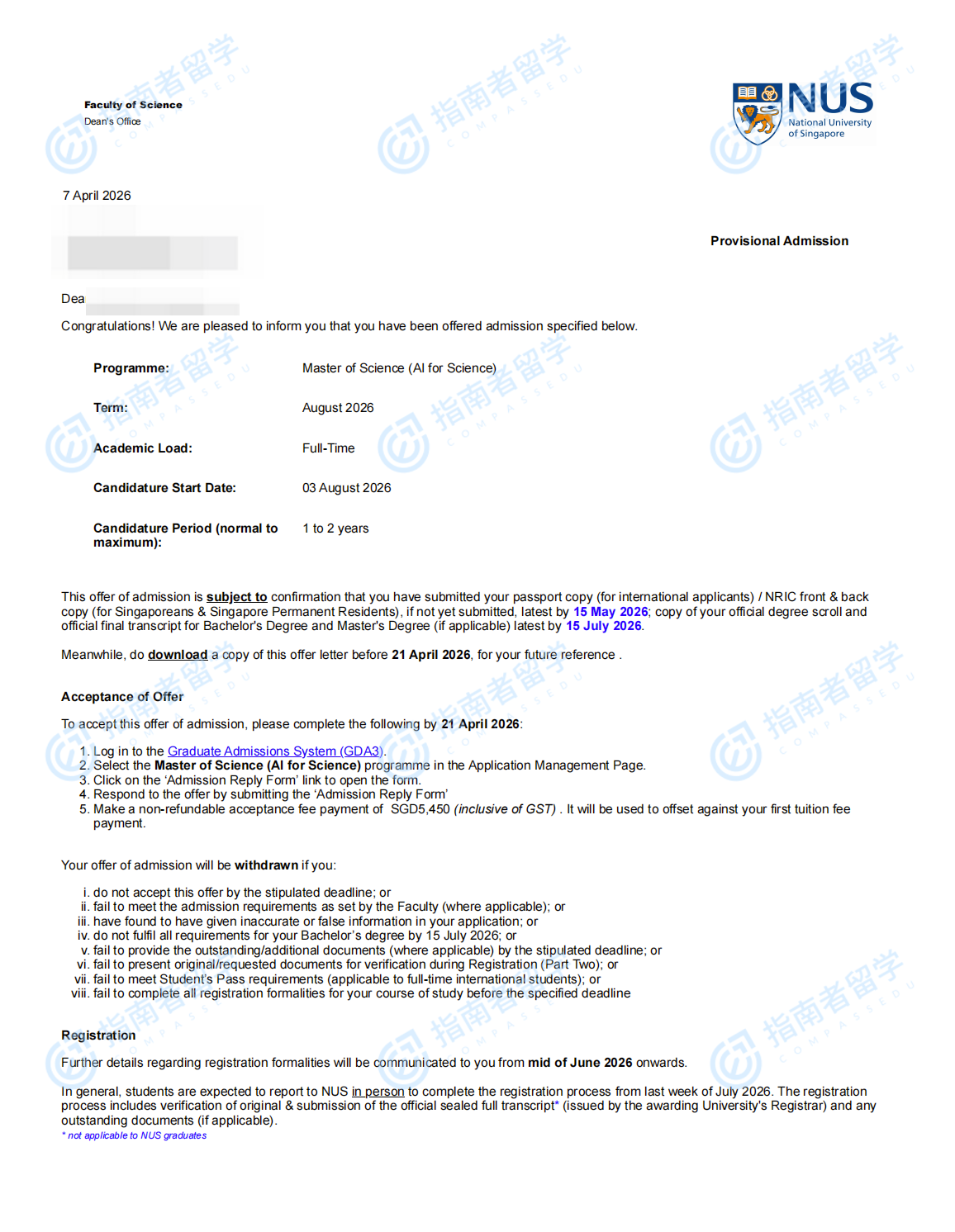 新加坡国立大学科学智能理学硕士研究生offer一枚