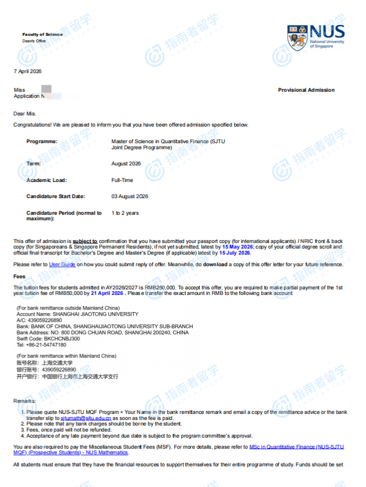 新加坡国立大学定量金融理学硕士(新加坡国立大学-上海交通大学联合开设)研究生offer一枚