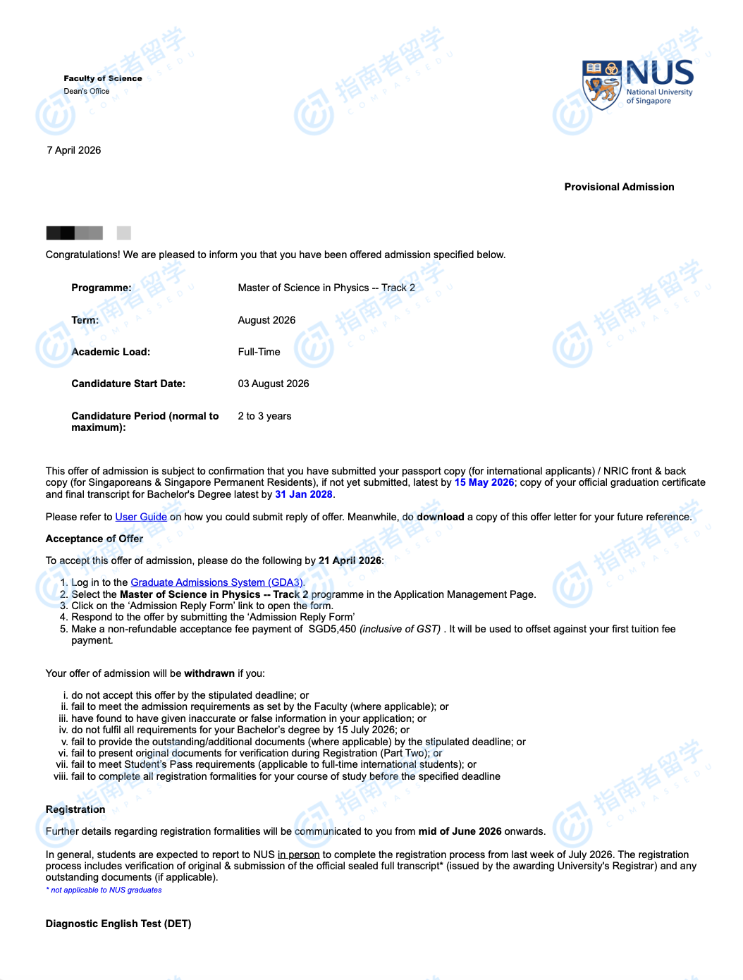 新加坡国立大学物理学理学硕士研究生offer一枚