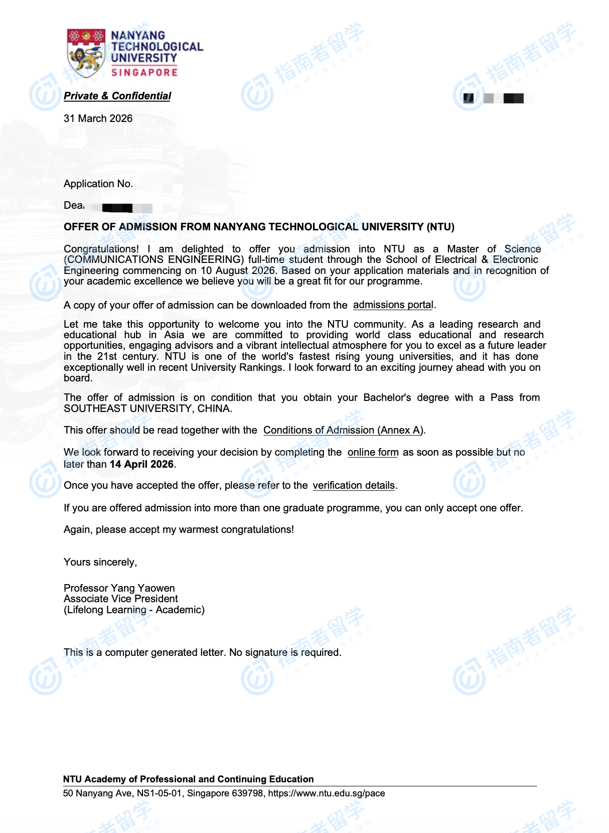 南洋理工大学通信工程理学硕士研究生offer一枚