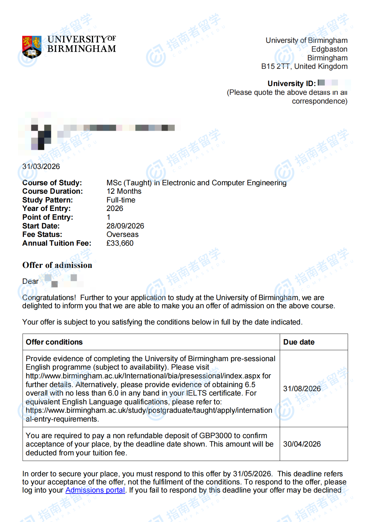 伯明翰大学电子与计算机工程理学硕士研究生offer一枚