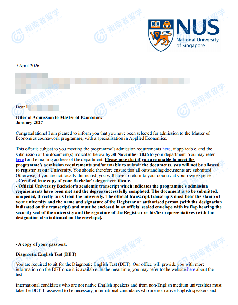 新加坡国立大学经济学硕士研究生offer一枚