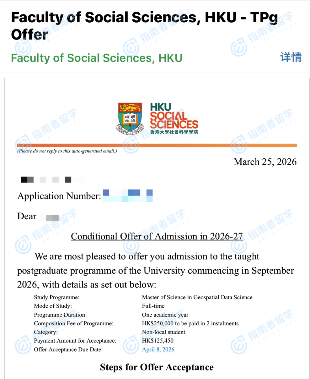 香港大学地理空间数据科学理学硕士研究生offer一枚