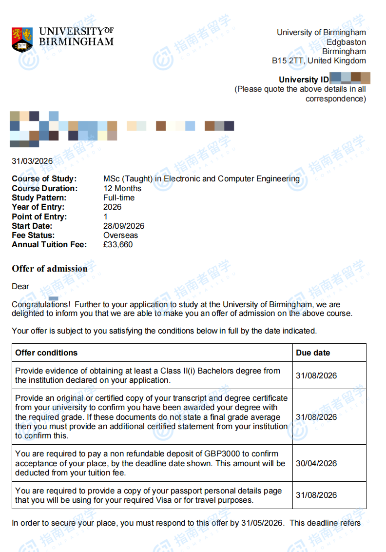 伯明翰大学电子与计算机工程理学硕士研究生offer一枚