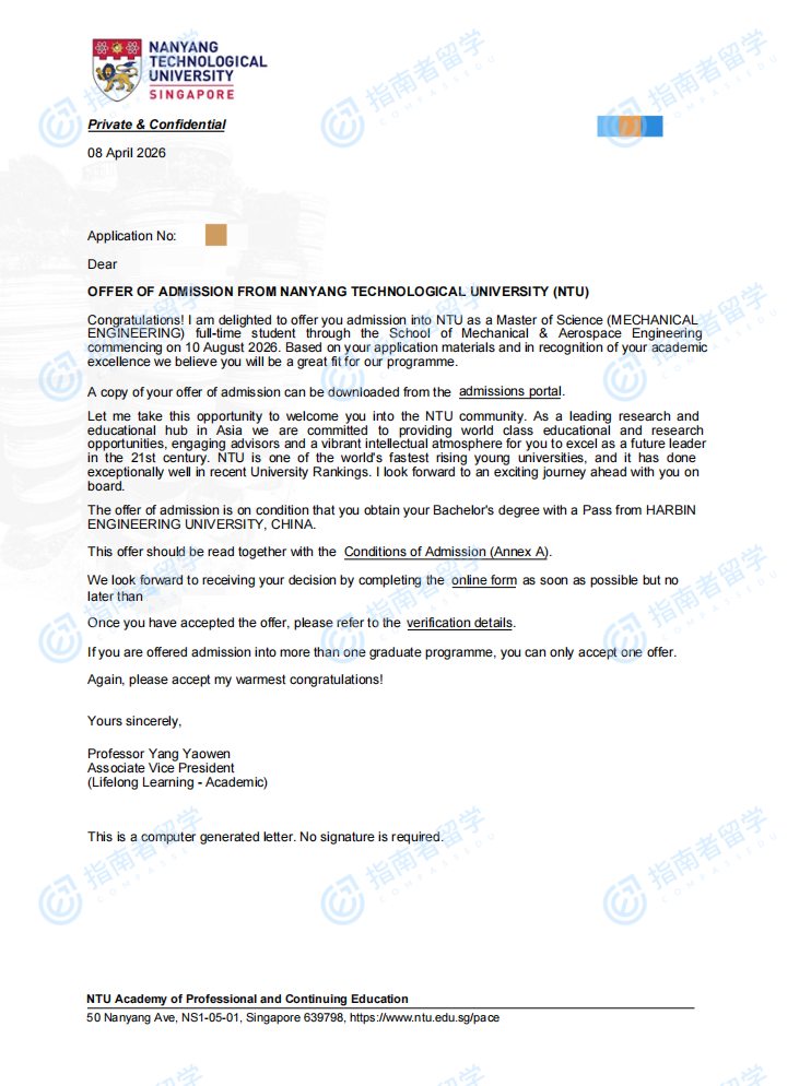 南洋理工大学机械工程理学硕士研究生offer一枚