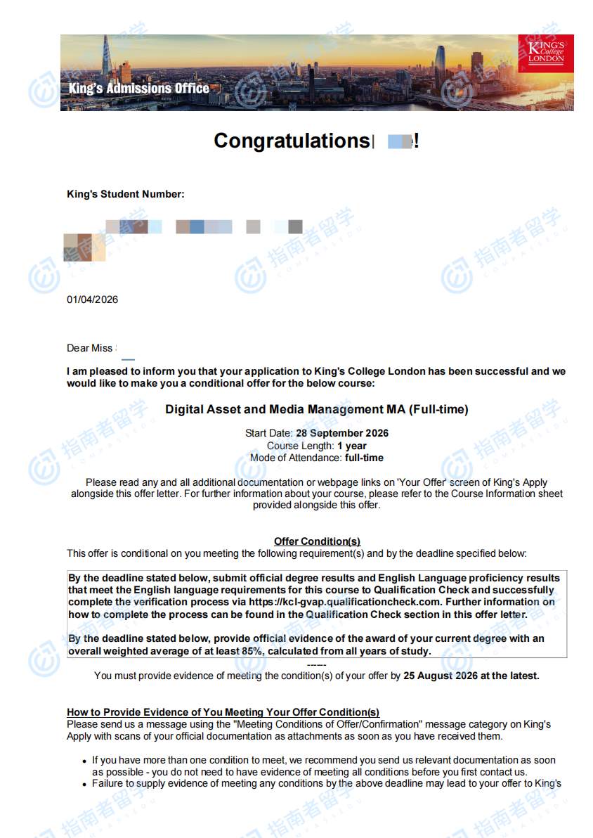 伦敦大学国王学院数字资产与媒体管理文学硕士研究生offer一枚