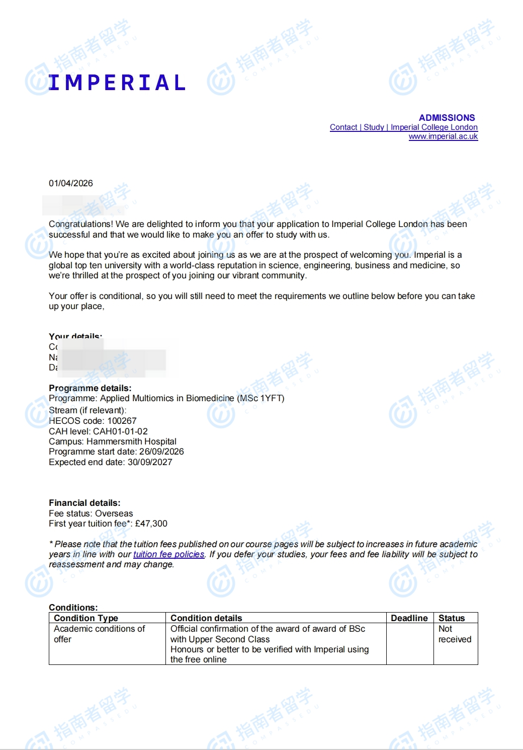 <p>帝国理工学院多组学在生物医学中的应用理学硕士项目旨在探索如何利用大数据和实验研究来彻底改变生物科学和生物医学,在实验室环境中应用新颖的实验技术来更好地了解疾病,在实验或计算疾病模型领域进行研究项目。在本课程中将探索“大数据”(组学)如何生成和用于理解生物学过程和疾病背后的机制,本课程专为有志于从事现代生物医学事业的学生而设计,学生将学习提取相关信息并对选定的目标进行功能分析。在学习期间,学生将学习现代生物医学研究中的一系列新概念,并在实践课程中提高其分析技能,从世界领先的研究人员那里学习不同的“组学”及其整合方式,以了解健康和疾病中的基因表达调控。学生还将在实验室应用新颖的实验技术,以更好地了解疾病的原因和潜在的治疗方法。为期六个月的研究项目是本课程的主要组成部分,在此期间,学生将成为主导实验室的成员,并进行创新研究,最终完成硕士论文和口头评估。</p>