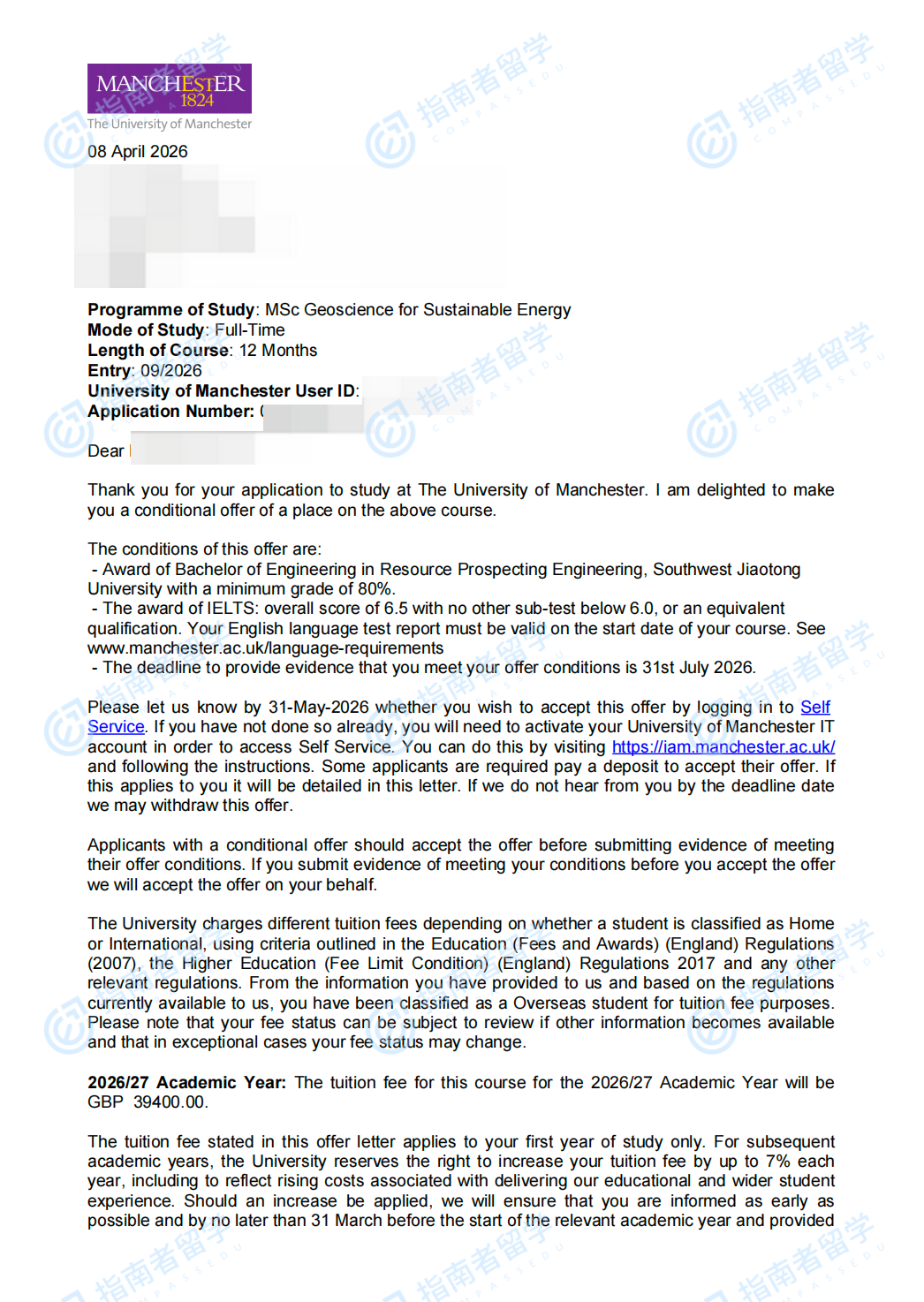 曼彻斯特大学可持续能源地球科学理学硕士研究生offer一枚