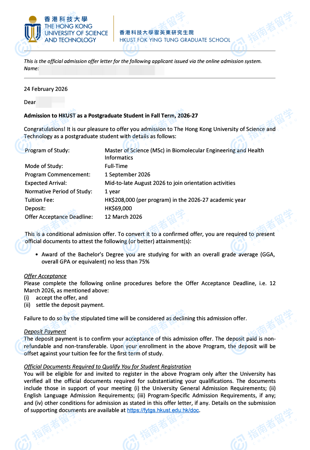 香港科技大学生物分子工程与健康信息学理学硕士研究生offer一枚