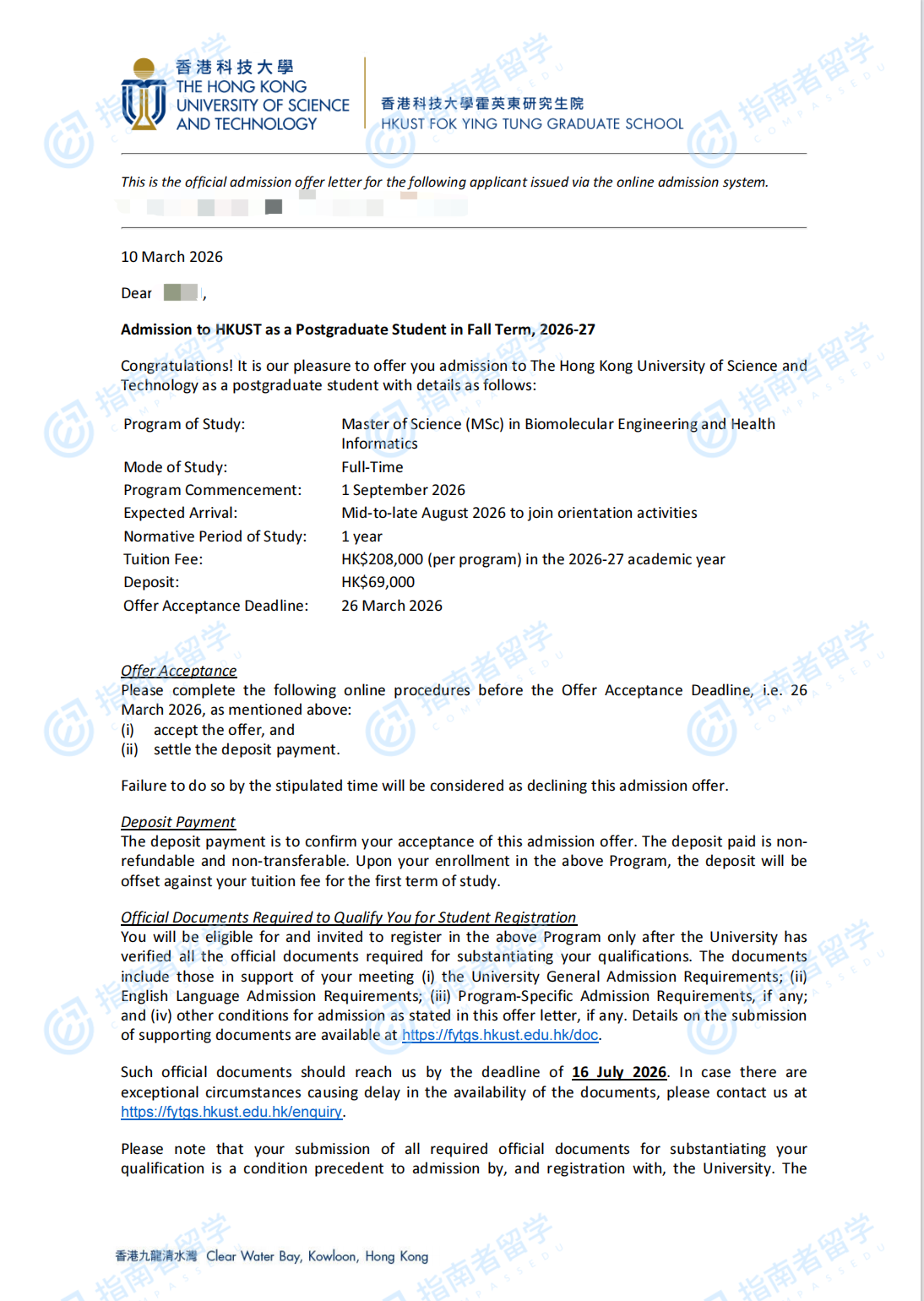 香港科技大学生物分子工程与健康信息学理学硕士研究生offer一枚