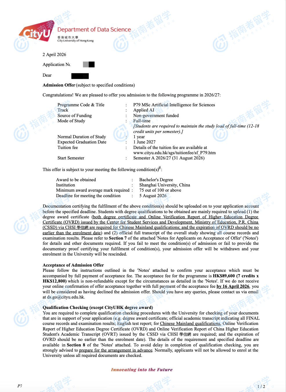 香港城市大学科学人工智能理学硕士研究生offer一枚