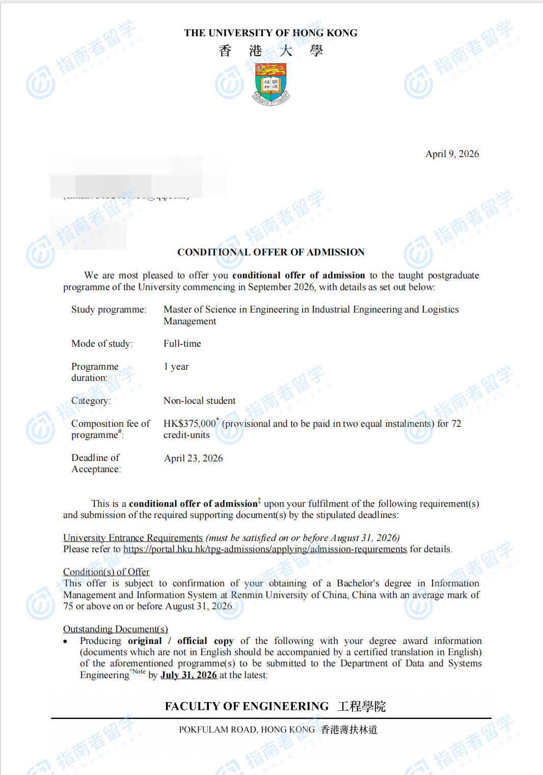 香港大学工业工程与物流管理(工程)理学硕士研究生offer一枚