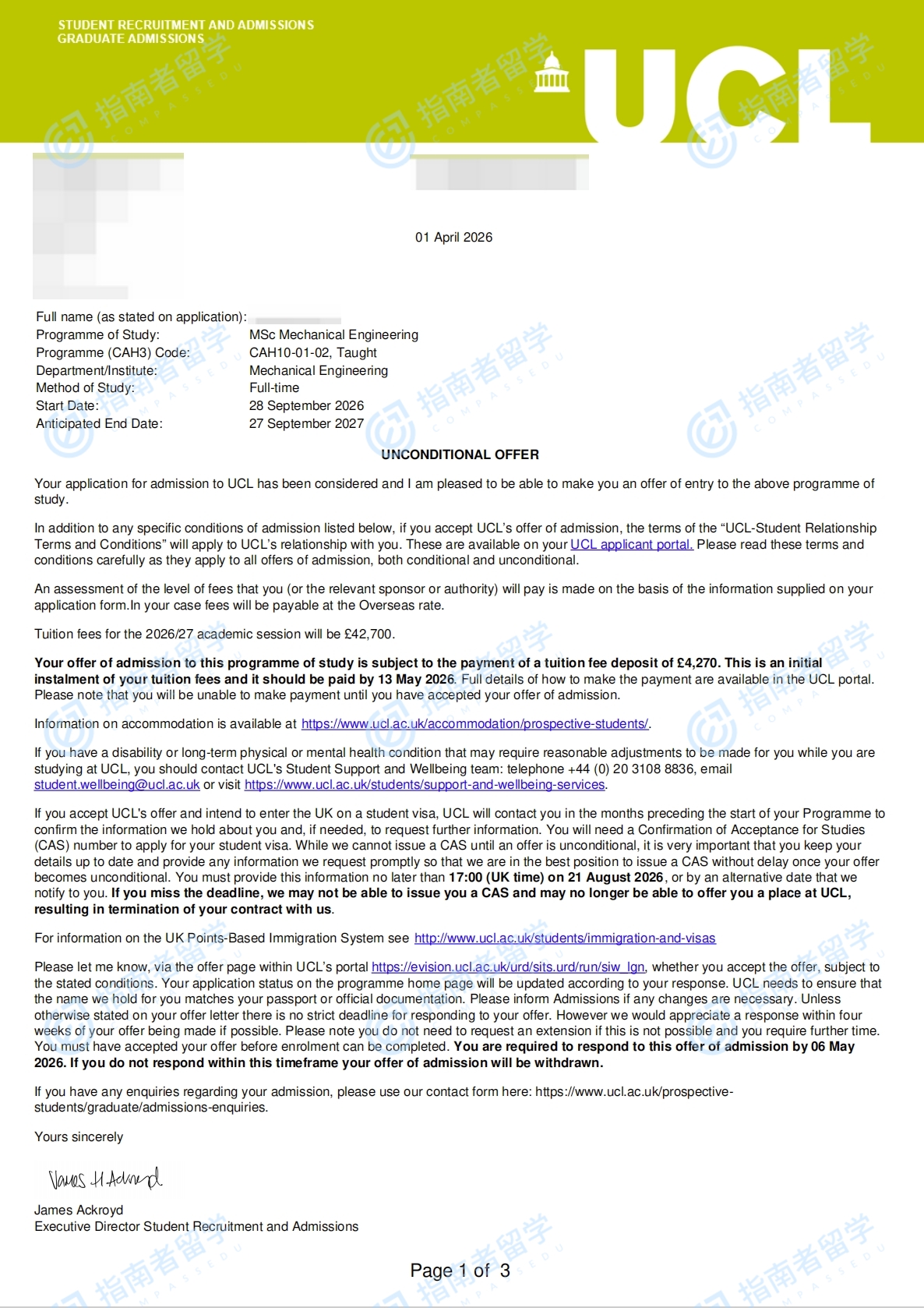 伦敦大学学院机械工程理学硕士研究生offer一枚
