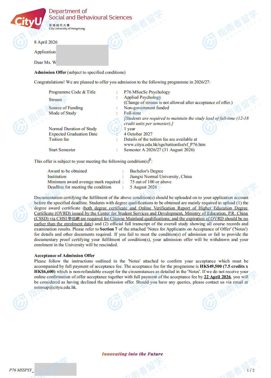 香港城市大学心理学社会科学硕士研究生offer一枚
